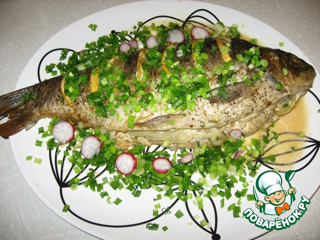 Достаем рыбу из духовки, выкладываем на блюдо,...