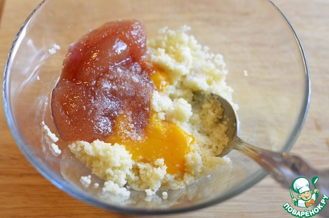 Кус-кус залить кипятком, так чтоб вода полностью его накрывала. Дать постоять 2-3 минуты (он разбухнет) немного остудить. Выложить икру судака, 2 желтка, посолить и хорошо перемешать.