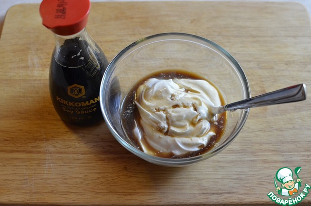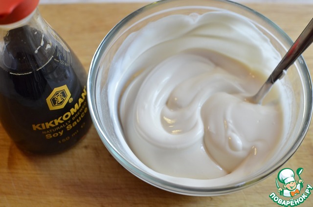 В мискочку выложить сметану, соевый соус.