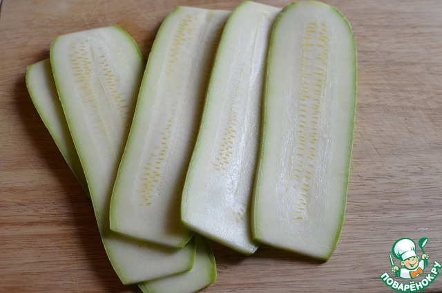 Кабачок порезать тонкими пластинами