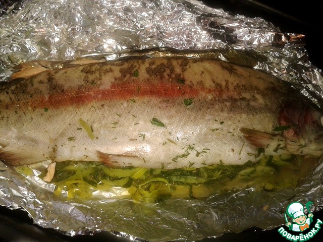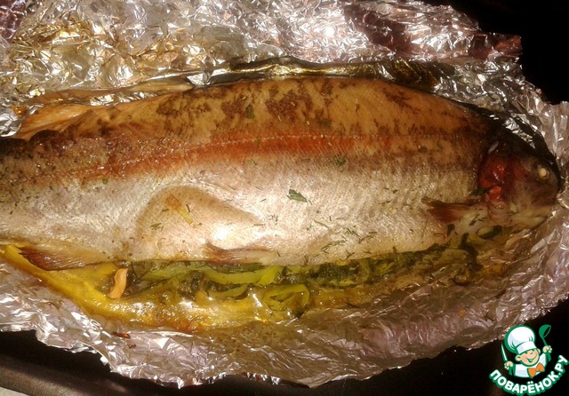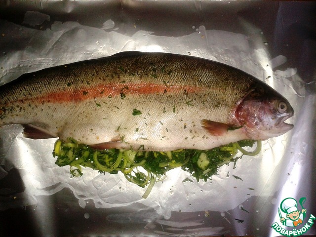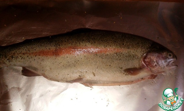 На смазанную оливковым маслом фольгу кладём чистую потрошеную сухую форель, солим, перчим, натираем специями;