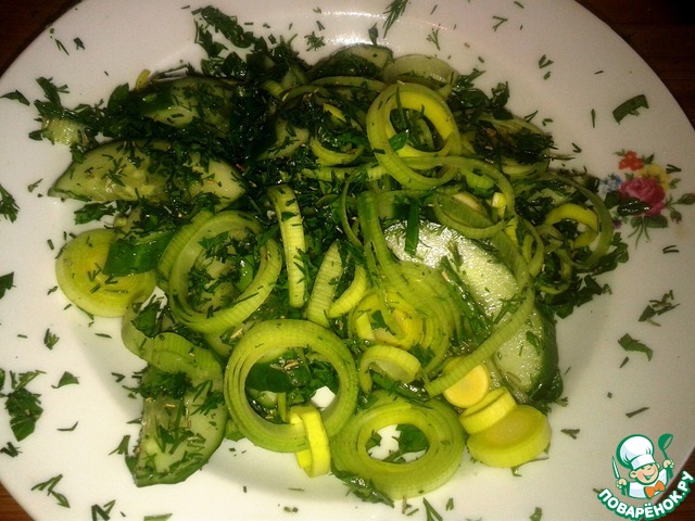 В начинку нарезаем крупно огурец, лук-порей кольцами, и мелко петрушку с укропом. Можно немного подсолить, поперчить - всё по вкусу.