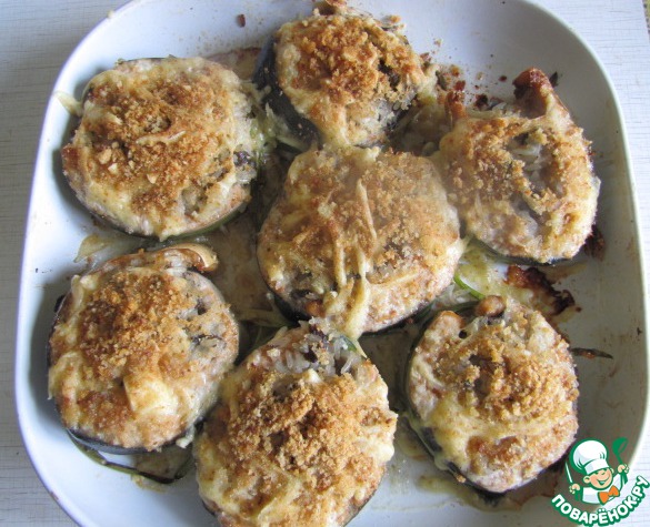 Выложить медальоны в хорошо смазанную маслом форму для запекания. Посыпать натертым сыром и панировочными сухарями.