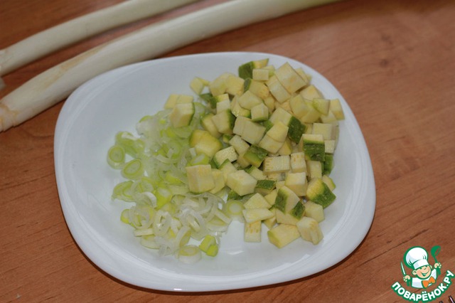 Нарезать кубиками цуккини и лук-порей (белую его часть)