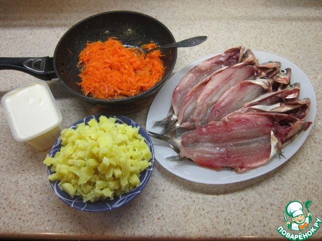 Итак имеем: обжаренную морковку, нарезанный мелкими кубиками картофель, филе рыбки с головой и хвостом и деревенские сливки.