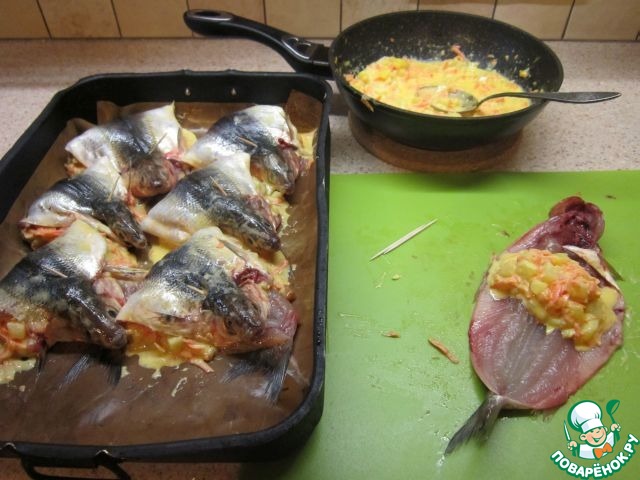 Нафаршировать рыбку, закрепить зубочисткой.