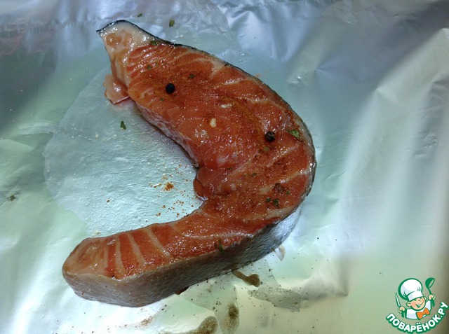 Затем каждый полустейк выкладываем на фольгу, солим, перчим и по 2 шт перца горошком вдавливаем в мякоть рыбы.