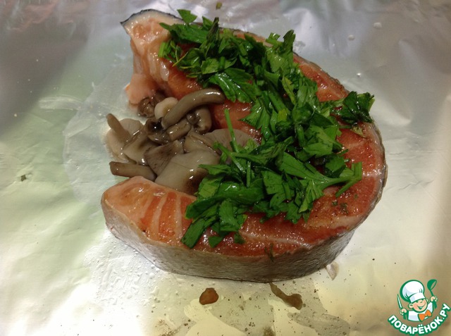 Аккуратно запаковываем нашу рыбку и отправляем в духовку на 20-25 мин при 200 градусах.