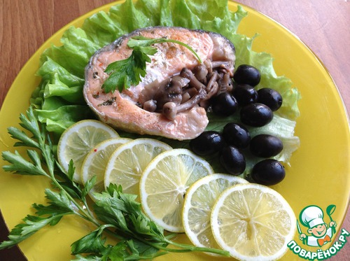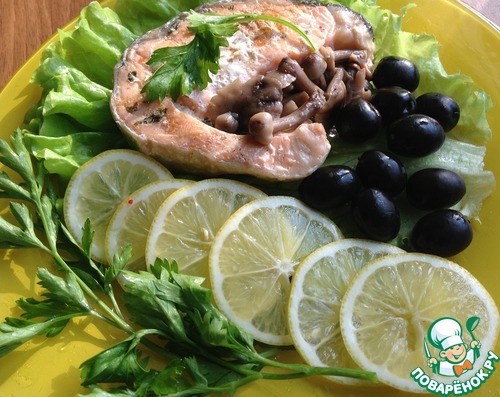 Рыбу сворачиваем полукольцом и рядом с брюшком выкладываем 1 ст. л. грибов.