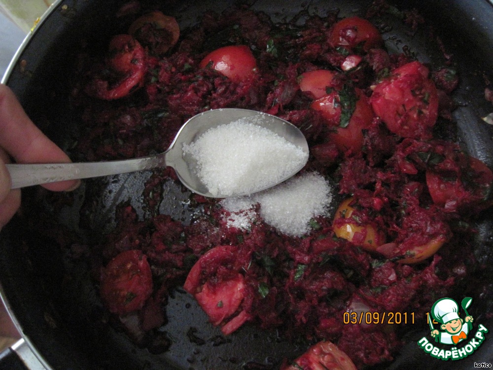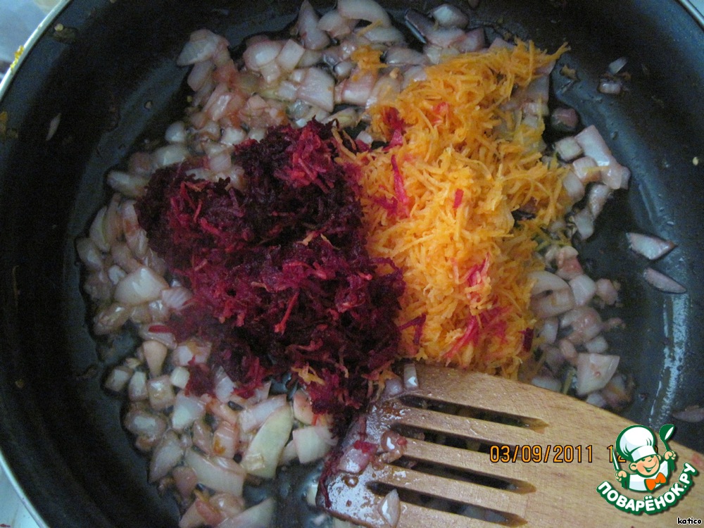 Мелко нарезанные чеснок и лук обжарить на оливковом масле. Добавить тертую свеклу и морковь, хорошо перемешать.