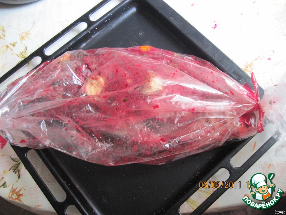 Запекать в духовке на небольшом огне около часа, затем рукав АККУРАТНО (!!) разрезать и оставить рыбу в духовке до зарумянивания, периодически поливая выделившимся соком.