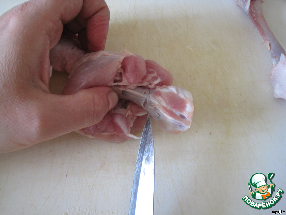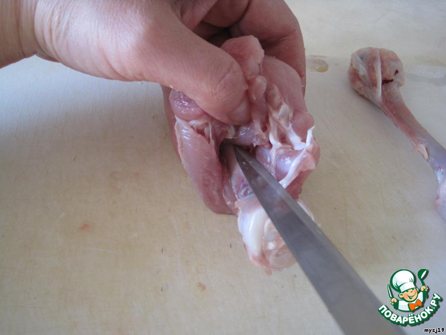 Отодвигаем мясо аккуратно вниз и обрезаем жилки.