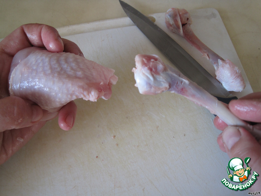 Теперь берем голень в одну руку, а косточку в другую, и аккуратно вращательными движениями вынимаем кость через низ.