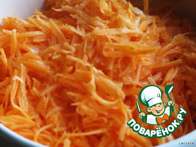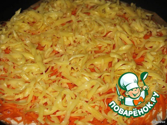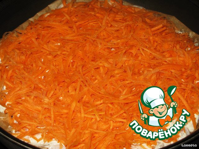 | Нежные кусочки филе накрытые морковной шубкой так и тают во рту. |