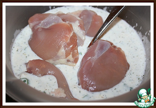 1. Соединить все ингредиенты, кроме куриной грудки и масла. Хорошо перемешать.