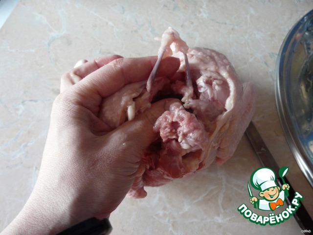 Вынимаем грудину. Я практически всю ее освобождаю от мяса руками, ножом подрезать надо только в середине. В это время мясо птицы как бы выворачиваем наизнанку – так удобнее. После грудины удаляем косточки вместе с шеей - здесь нож помогает.