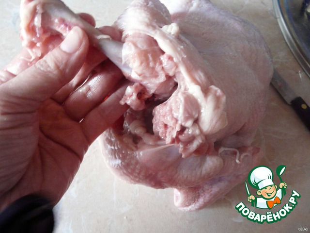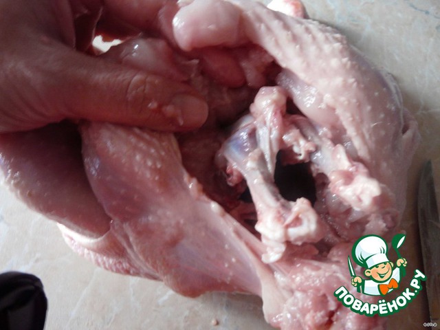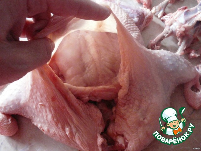 Теперь самое трудное место - на спинке где тазовые косточки. (Здесь самая тонкая кожа, можно повредить.) Удаляем эту косточку, можно и снизу (как удобнее). Последними – косточки из ножек, выворачивая их.