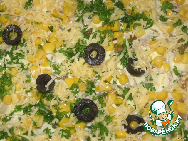 Сверху выложить кукурузу, мелко рубленую зелень (укроп, петрушку), посыпать сыром, украсила маслинками. В духовку 180 С на 30 минут (подстраивайтесь под свою).