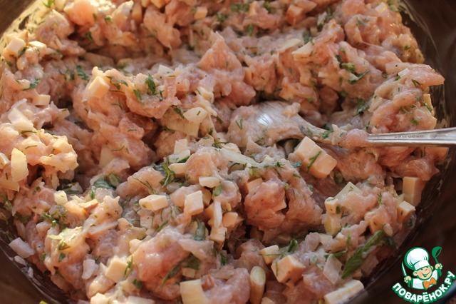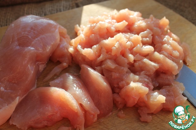 Филе режем маленькими кубиками ( масса должна быть похожа на фарш ).
