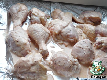 Противень застелить фольгой (чтобы потом было меньше отмывать). Замаринованную курочку выкладываем на противень, и отправляем в уже нагретую духовку до 200 гр, примерно на 30 минут, и запекаем до готовности.