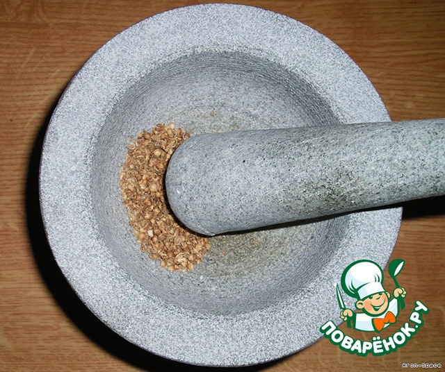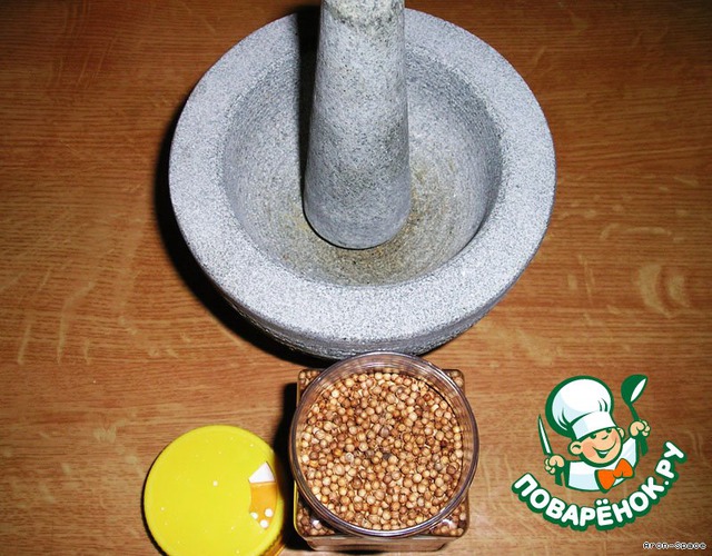 Теперь нам нужно приготовить кориандр, благодаря которому, впрочем, эта курочка и получила своё название. Можно использовать уже готовый, молотый кориандр, но я настоятельно рекомендую смолоть зёрна кориандра самостоятельно.