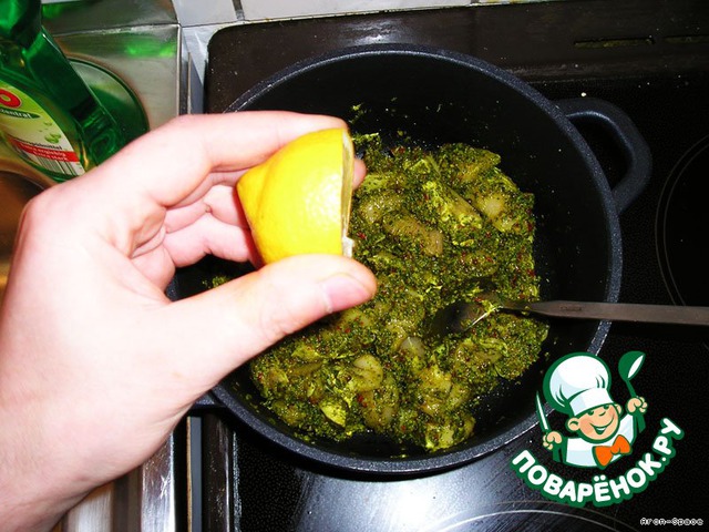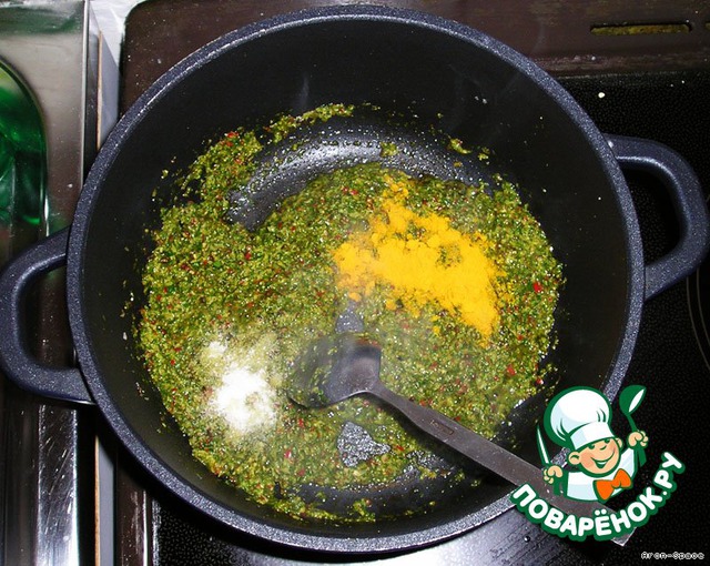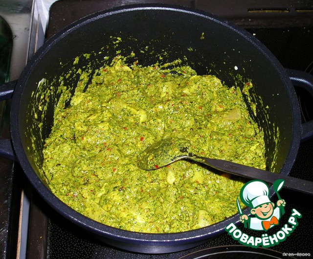 Теперь добавляем полученный нами ранее соус из листьев кориандра. При постоянном помешивании жарим всё это дело, пока не выпарится часть воды, а соус не загустеет.
