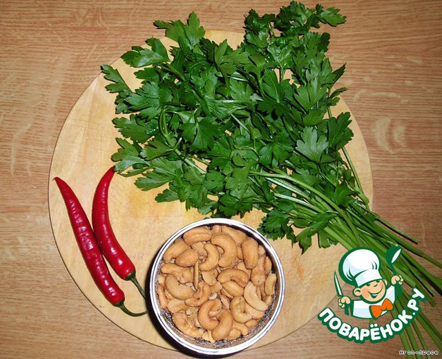 Теперь приготовим соус, который будет состоять из зелени Кориандра (Петрушки), орехов Кешью и перчиков "Чили". Перчик очистите от семян, а зелень немножко порубите ножом.