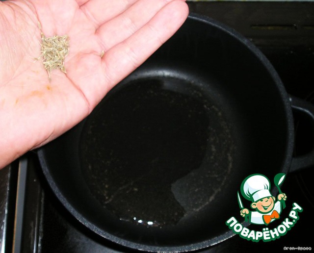 Нагрейте в сковороде или кастрюле с непригорающим покрытием несколько ложек оливкового масла. Поместите в это масло Кумин (Зиру)