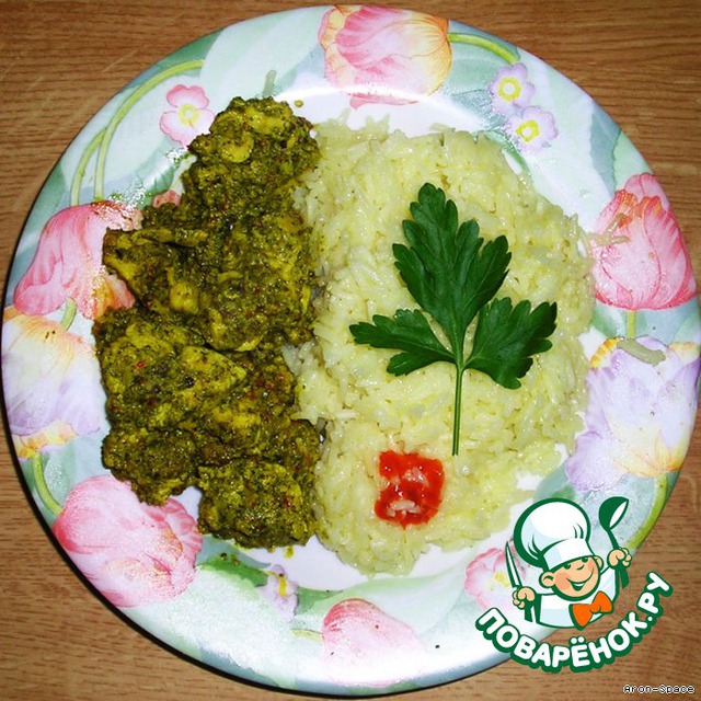 Готовое блюдо подаём с рисом, украсив зеленью.