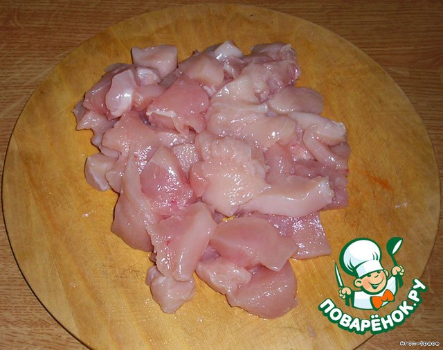 Итак, для начала нарежем филе курицы на небольшие ровные кусочки.