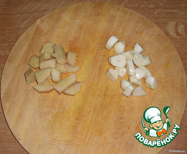 Очистите от кожицы корень имбиря и возьмите примерно такое же количество (по весу) зубчиков чеснока.