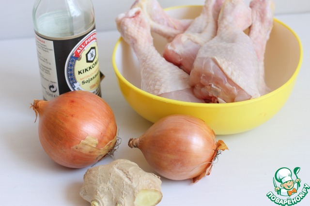 Итак подготовим такие продукты. Нам понадобится курица. Я взяла куриные голени. Можно взять любые части или порезать курочку. Так же нам нужeн соевый соус, лук, имбирь и специи.