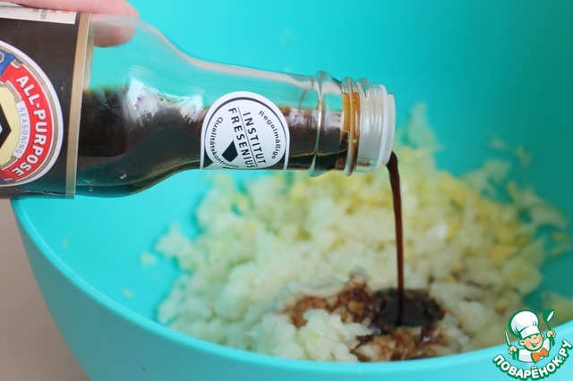 Добавим теперь соевый соус к измельченой массе. Так же посолим, добавим любые ваши любимые специи, у меня для мяса. И еще нужен был соус чили, или сладкий. У меня был просто томатный соус.