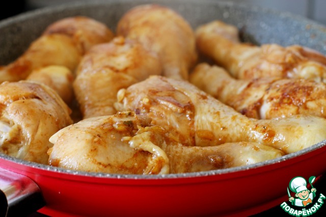 Кладем теперь наши куриные голени, перемешиваем и оставляем на час минимум. Можно такое мясо мариновать заранее.