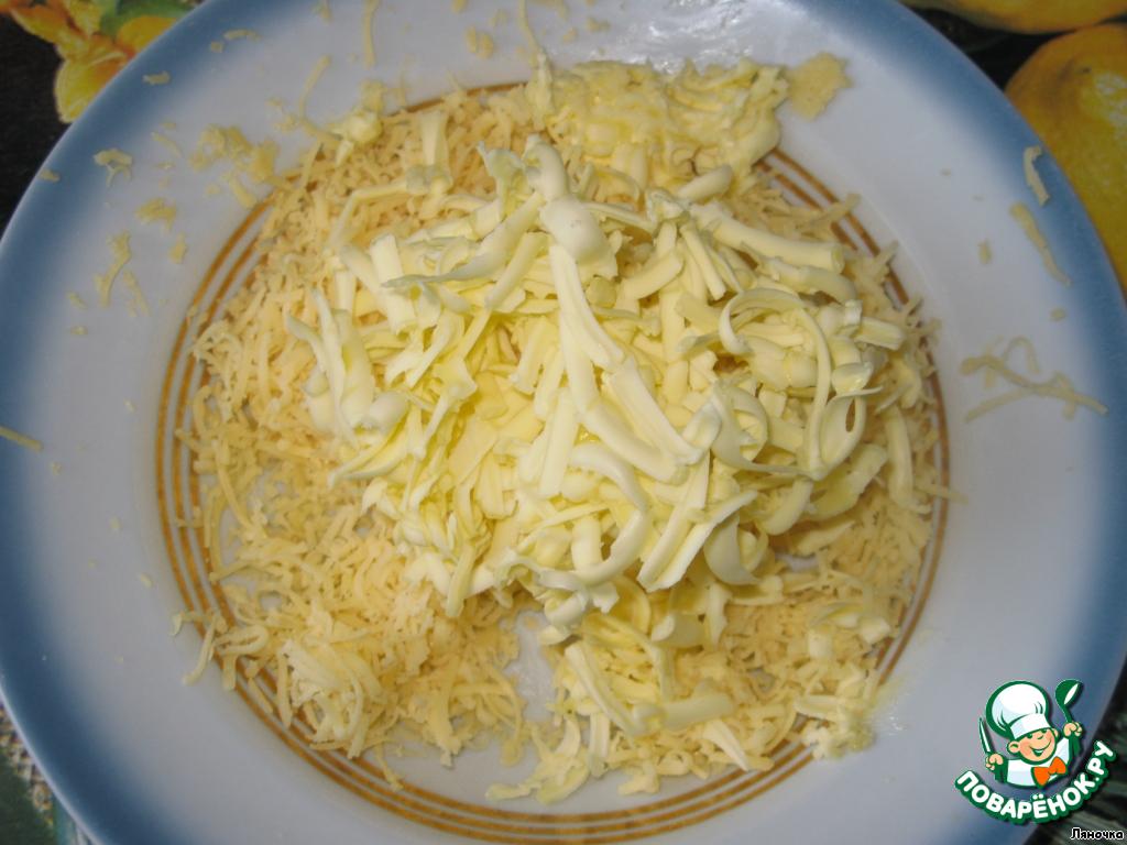 Для начала приготовить начинку: сыр и масло натереть на терке, перемешать и убрать в холодильник.