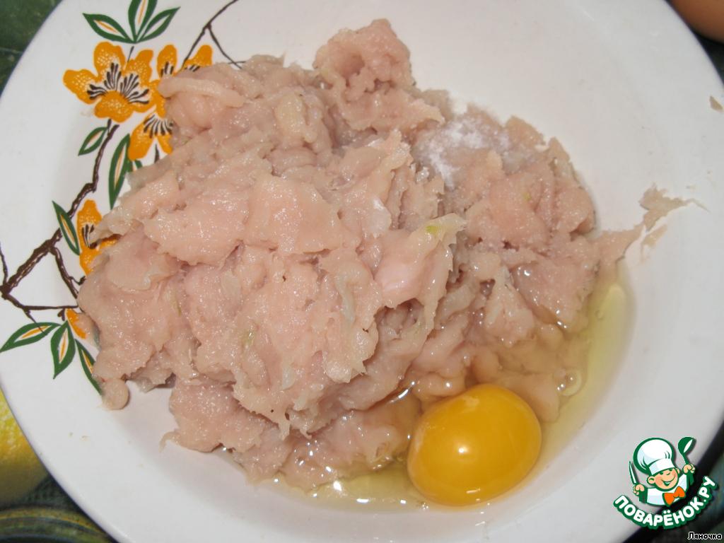 Готовим фарш: куриное филе и луковицу дважды пропускаем через мясорубку, добавляем яйцо, соль и тщательно вымешиваем.