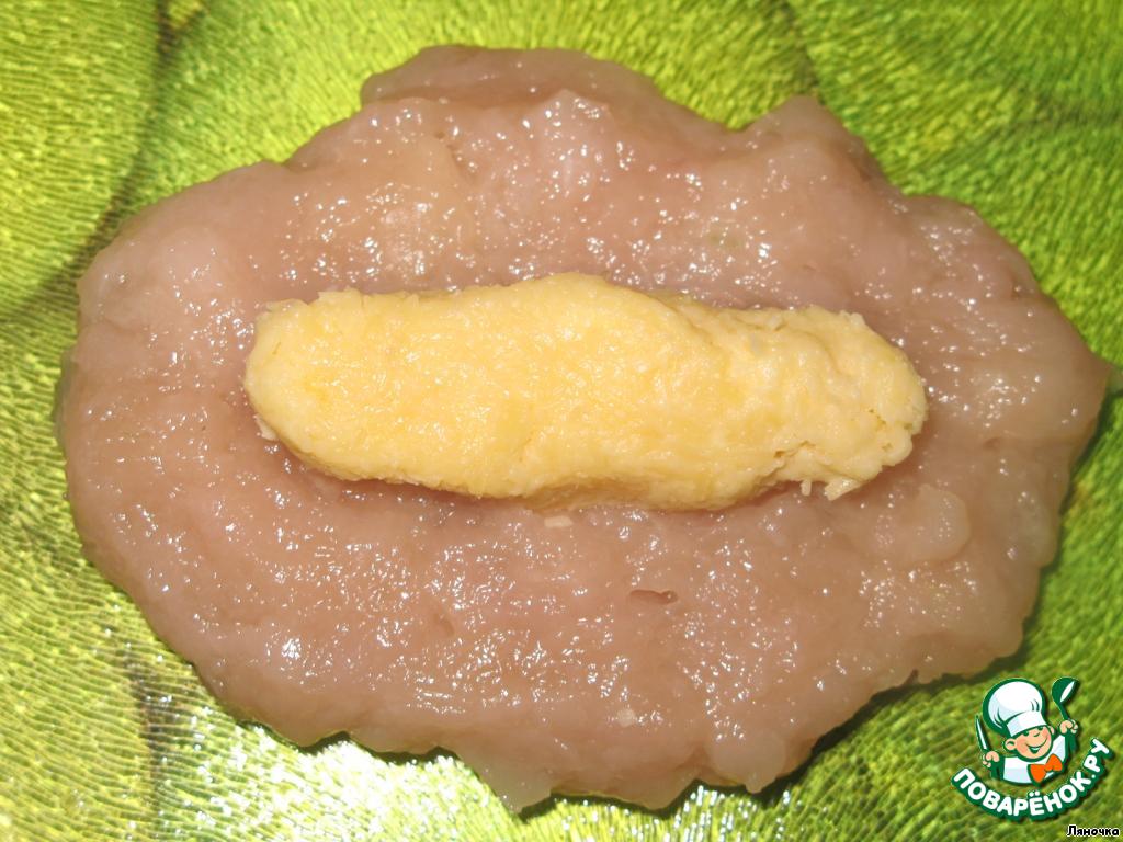 Из сырно-масляной смеси слепить колбаску, положить ее на лепешку из фарша.