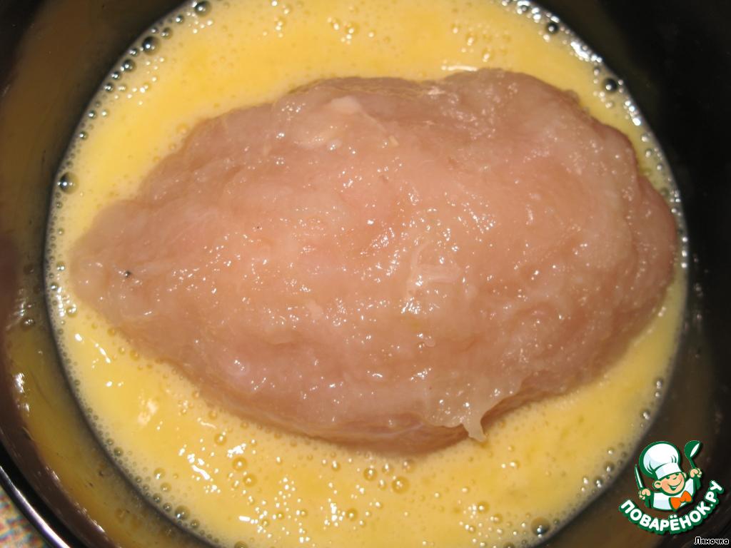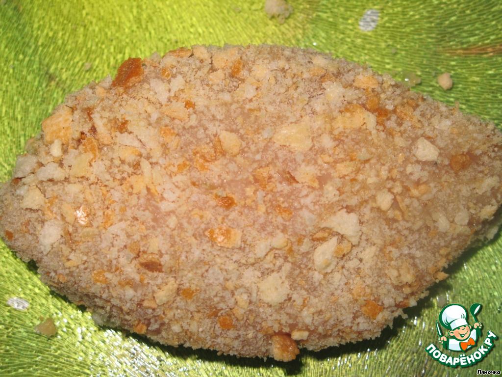 Приготовленную котлету обмакиваем во взбитое яйцо.
