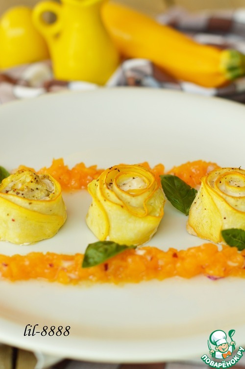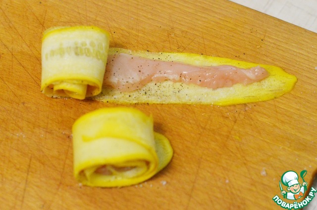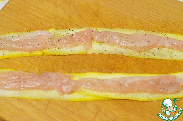 2. Филе нарезать тонкими пластинками, сбрызнуть оливковым маслом. Посолить, поперчить. На каждую пластинку кабачка положить полоску филе.