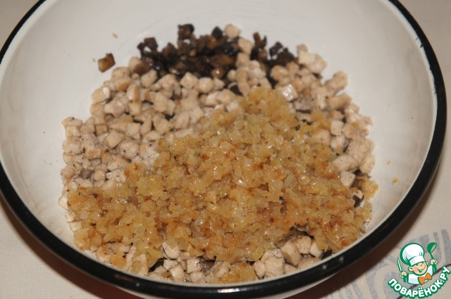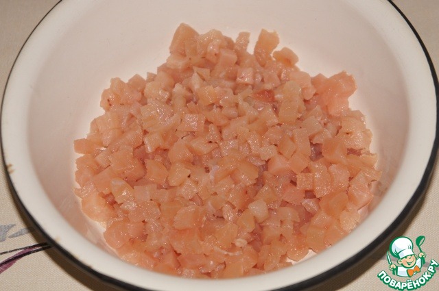 Филе нарезать очень маленькими кубиками и обжарить, посолить и поперчить.