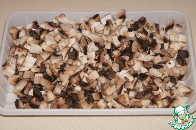 Грибы нарезать маленькими кубиками и обжарить до испарения жидкости, приправить по вкусу.
