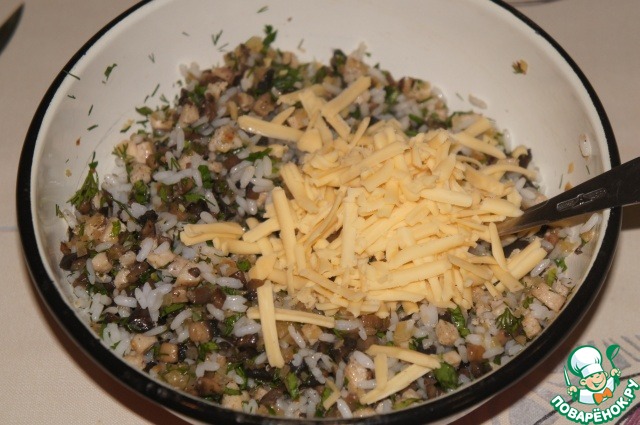 Сыр, взбитое вилкой яйцо (немного оставить для смазывания) и пару столовых ложек мелко нарезанной зелени. Смесь хорошо перемешать.