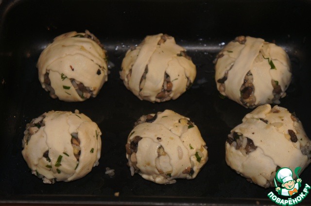 Смазать взбитым яйцом и запечь в горячей духовке, пока не подрумянятся.