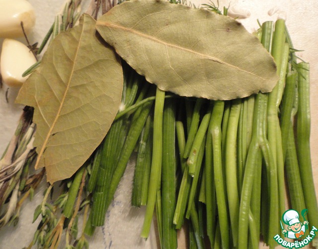 Берем 2-3 веточки розмарина, 5-6 веточек тимьяна, "хвосты" от пучков петрушки и укропа, два лавровых листа.
