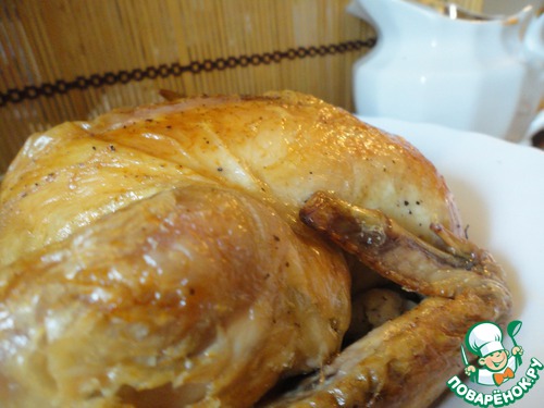Через час вынимаем куру из духовки, сливаем сок. Нагреваем духовку до 200 градусов и возвращаем в нее курочку для появления румяной и хрустящей корочки еще на 30 минут.