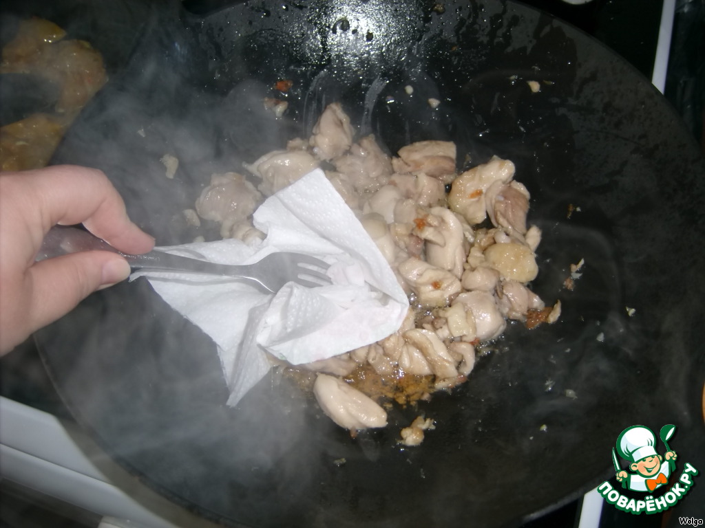 Разогреть масло в воке или сковороде, обжарить курицу до готовности при постоянном помешивании в течение 6-8 мин. Удалить лишнюю жидкость салфеткой и вилкой.