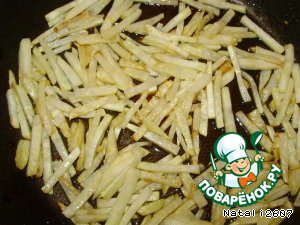 Очищенный корневой сельдерей нарезать соломкой и обжарить на растительном масле до золотистого цвета.