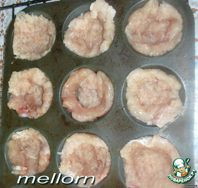 Формочки смазать растительным маслом, выложить филе (оставив место для начинки).
