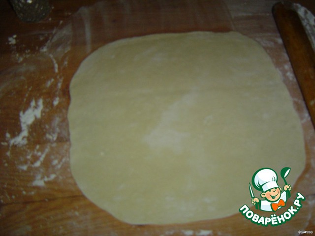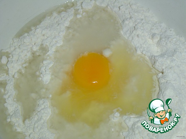 Пока курятина тушится, готовим тесто. К муке добавляем яйцо, воду, немного соли и замешиваем тесто.