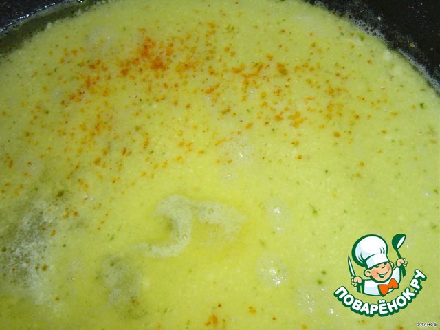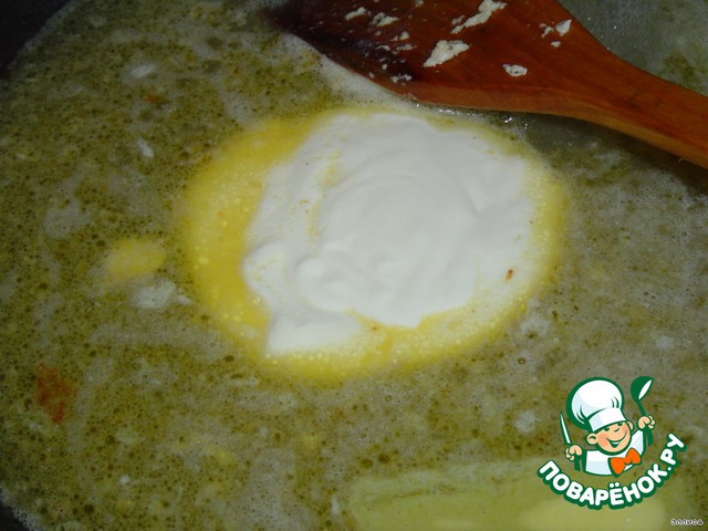 Готовим подливку. Для этого надо растопить в сковороде сливочное масло (70г), добавить к нему сметану, воду, травы, сушеный лук, соль, перец и проварить в течение 5 минут.